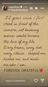 नयनतारा ने अपने इंस्टाग्राम की स्टोरी पर एक तस्वीर साझा की है। यह तस्वीर एक लिखे हुए नोट की है। इस नोट में अभिनेत्री ने लिखा, ‘22 साल हो गए जब मैं पहली बार कैमरे के सामने खड़ी हुई थी, तब मुझे नहीं पता था कि फिल्में मेरे जीवन का प्यार बन जाएंगी। हर शॉट, हर फ्रेम, हर खामोशी, ने मुझे आकार दिया, मुझे ठीक किया और मुझे वह बनाया जो मैं हूं। हमेशा आभारी रहूंगी।’साउथ की लेडी सुपरस्टार कही जाने वाली नयनतारा ने इंडस्ट्री में अपने 22 साल पूरे कर लिए हैं। इस मौके पर नयनतारा ने एक इमोशनल नोट लिखा है। इस नोट में नयनतारा ने फैंस का शुक्रिया जताते हुए अपने किरदारों और करियर के अनुभवों के बारे में भी बात की है।