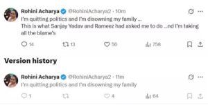 पटना :- बिहार में राष्ट्रीय जनता दल की करारी हार के बीच यादव परिवार में ही फूट पड़ गई है. लालू यादव की बेटी रोहिणी आचार्य ने सोशल मीडिया साइट एक्स पर परिवार से नाता तोड़ने का ऐलान किया है. एक पोस्ट में उन्होंने राज्यसभा सांसद संजय यादव का जिक्र करते हुए कहा कि मैं सारा दोष खुद पर ले रहीं हूं.