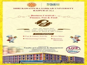 रायपुर :- छत्तीसगढ़ की राजधानी रायपुर के श्री रावतपुरा सरकार यूनिवर्सिटी में 05 मार्च को “Business Carnival : finance, fun and food” का आयोजन किया गया है।