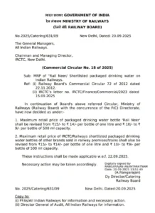 रेलवे बोर्ड के नए आदेश (सर्कुलर संख्या 18/2025) के मुताबिक अब रेल नीर और रेलवे द्वारा चुने गए अन्य पैक्ड पानी के ब्रांड पहले से सस्ते मिलेंगे। इस फैसले से यात्रियों को सीधा फायदा होगा, क्योंकि अब वे ट्रेन या स्टेशन पर कम दाम में पानी की बोतल खरीद पाएंगे। बोर्ड ने साफ किया है कि, यह नई कीमतें 22 सितंबर 2025 से पूरे देश में लागू होंगी। यानी इस तारीख के बाद ट्रेन में सफर करने वाले यात्रियों को रेलवे स्टेशनों और ट्रेनों में पानी की बोतलें नए कम रेट पर मिलेंगी।